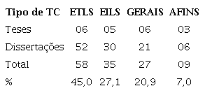 Observamos (Quadro 4) a seguinte distribuição dos trabalhos específicos do EILS, no que se refere aos programas em que foram realizadas: vinte e oito (28) na PGET-UFSC, sendo cinco (5) teses e vinte e três (23) dissertações; duas (2) dissertações na POET-UFC; e cinco (5) dissertações no POSTRAD-UnB. Os temas são bem diversificados e os mais recorrentes são: análise de características da interpretação (8); interpretação em diferentes contextos (6); aspectos profissionais (5); e uso de estratégias (5).