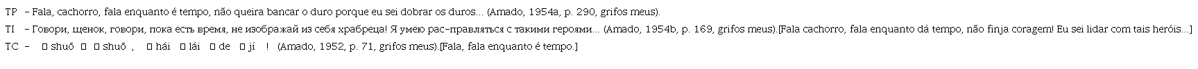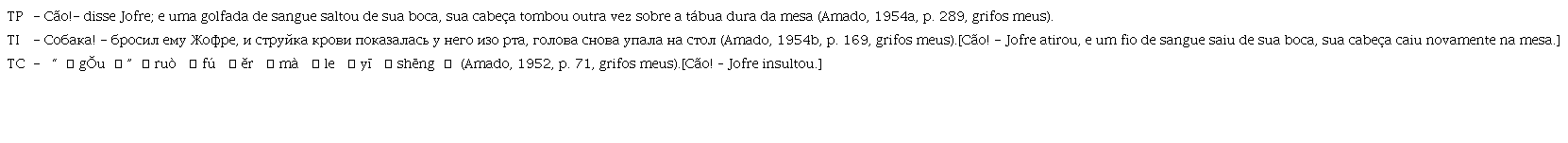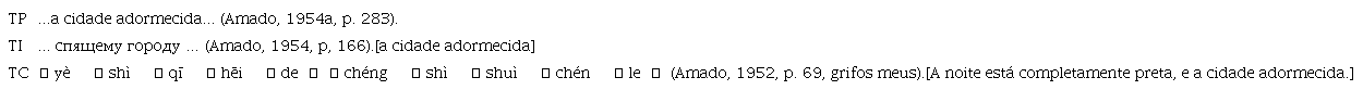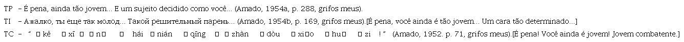 Vale a pena conhecer mais dois exemplos de omissão na tradução (TP: Texto de Partida, TI: Texto Intermediário, TC: Texto de Chegada):