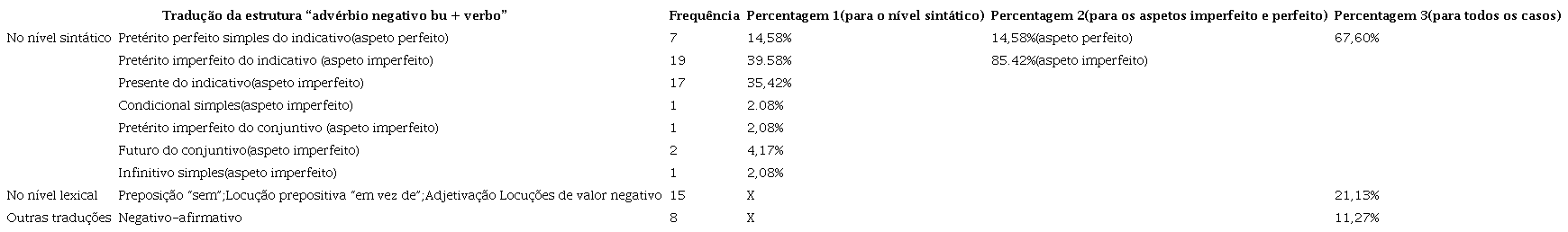 Nesta parte, analisaremos as traduções efetuadas no nível sintático. Tendo em conta o limite do espaço deste trabalho, iremos citar uns exemplos típicos para a ilustração das orientações tradutórias do advérbio negativo “bu” (ou seja, a estrutura “advérbio negativo bu + verbo”). Aliás, devemos salientar que, conforme exposto anteriormente, o advérbio negativo “bu” está associado ao tempo imperfeito, pelo que é bem provável que nas traduções portuguesas o aspeto predominante também seja o imperfeito. E para as “exceções” na tradução portuguesa, ou seja, para os casos em que o aspeto é perfeito, iremos listá-los para uma análise mais detalhada.