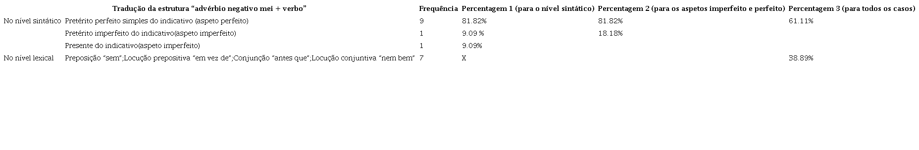 De acordo com a nossa pesquisa, existem, no total, 21 ocorrências do advérbio negativo “mei” no nosso corpus; depois de um filtro manual, conseguimos localizar 18 ocorrências da estrutura “mei + verbo”. Vejamos as seguintes tendências tradutórias desta estrutura.