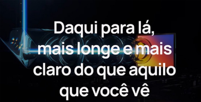 Nesta publicidade, mostra-se a estrutura mecânica da câmera, que consiste em seis partes, da esquerda para a direita: a lente, quatro aberturas da lente e a chapa fotográfica. O fundo é preto, e uma linha azul perpendicular atravessa a lente e as aberturas, chegando à fonte da câmera. A publicidade apresenta a metáfora de que: a câmera é um olho de boa visão. O domínio alvo é a câmera do produto, a qual se apresenta visualmente, e o domínio fonte mostra-se escrito. O texto “daqui para lá, mais longe e mais claro que você vê” enfatiza a ideia de uma boa visão óptica. Ao combinar com os componentes da câmera na imagem, a publicidade leva o público-alvo brasileiro a fazer uma associação da câmera com os olhos humanos. A estrutura da câmera é como a de um olho, pois a lente cristalina é convexa, enquanto a retina do olho recebe estímulo da luz para formar imagens, assim como acontece na formação de imagens na chapa fotográfica. A publicidade transmite uma ideia: tal como olhos de boa visão que conseguem enxergar objetos de longe com facilidade e clareza, a câmera do celular oferece aos usuários uma visão fotográfica clara para tirar fotos de objetos, pessoas e paisagens de uma distância remota com alta nitidez.