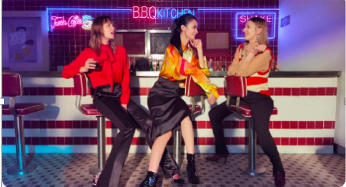Na figura 3, apresentam-se três jovens mulheres igualmente bonitas e iluminadas por luzes, sentadas no balcão de um restaurante. Visualmente, o plano de fundo escuro destaca o brilho das três mulheres. Elas estão vestidas com roupas de cores vivas na parte superior, conversam e riem, mostrando plenamente sua liberdade e alegria na fotografia. Três mulheres estão em foco, apresentando igualmente suas belezas na frente da câmera, atraindo a atenção e os olhares dos consumidores potenciais.