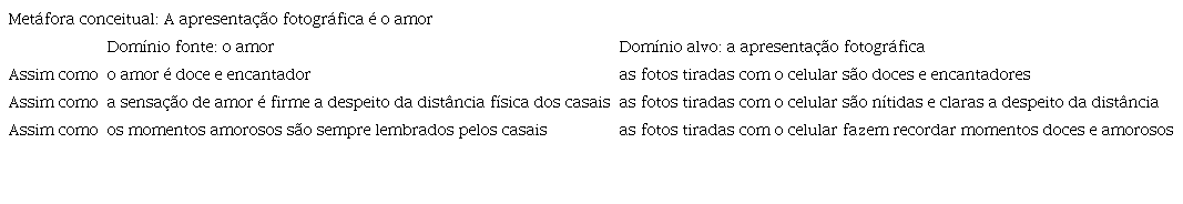 A transferência conceitual ocorre tanto na linguagem textual quanto nos elementos pictóricos (Forceville, 1996). Para os anunciantes, é frequente a utilização de imagens nas mídias de comunicação modernas para apresentar melhor seus produtos. Conforme Alousque (2014, p. 155), “conceptual metaphors should be encoded not just in language but also in other forms of communication like pictures, music, sounds, and gestures”. As metáforas empregadas na publicidade geralmente são multimodais. Como propõe Forceville (1996, p. 70), “advertisements are very rarely of a purely pictorial nature. Even though current advertising trends reveal a clear shift from the verbal to the pictorial, a minimum of text – if only a product’s name – is usually present”.
