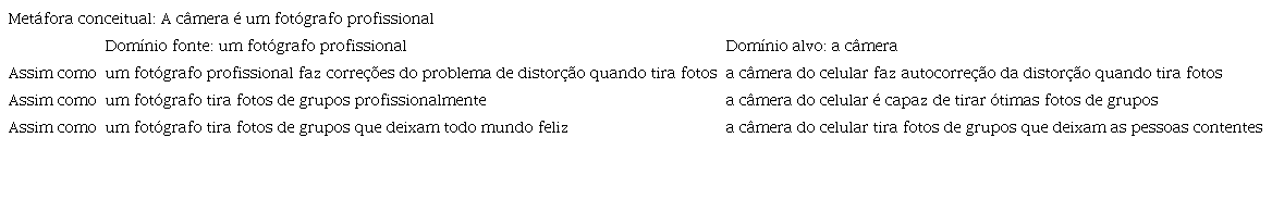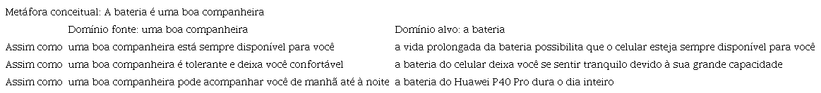 O mapeamento entre o domínio fonte e o domínio alvo representa as características e qualidade do produto via os conceitos e objetos familiares, como ilustrados nos casos 1, 2, 3 e 4. Os casos 1 e 2 tratam das características da câmera/foto do Huawei P40 Pro; o caso 3 é sobre a capacidade da bateria; e o caso 4 apresenta a tela do produto.
