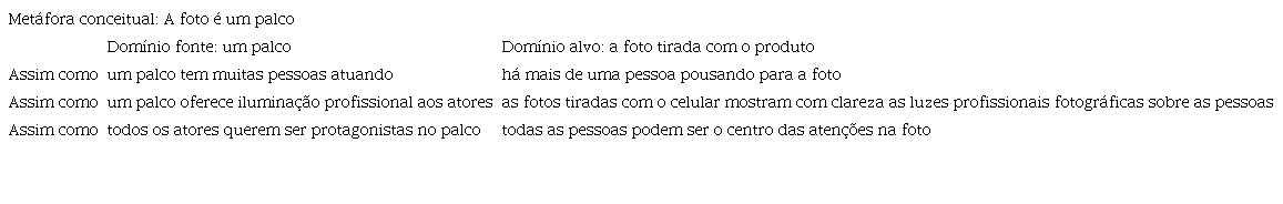 Quanto à metáfora na PWP-BR: A foto é um palco, o domínio fonte apresenta-se textualmente e o domínio alvo é mostrado pictoricamente. A combinação do subtítulo com a imagem, ressalta a existência de luzes azuis e roxas, iluminadas em um fundo escuro como se fosse a disposição da iluminação de um palco, destacam três figuras femininas bonitas na frente conversando com posturas naturais. Elas, nesta metáfora, são atrizes no palco. A nossa interpretação é baseada na estrutura lógica de um palco, onde há muitas pessoas que atuam, entretanto, cada uma é o centro do palco e desempenha seu próprio protagonismo sob uma boa iluminação. Com esta metáfora, o tradutor transmite a mensagem de que, em fotos de grupo, cada um pode se sentir à vontade em escolher sua posição e postura, porque todos são focos na fotografia tirada com o Huawei P40 Pro.