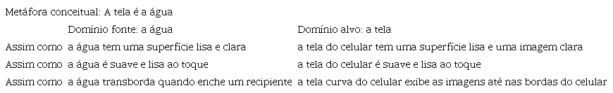 Ao considerar a intenção da publicidade, tanto o publicitário quanto o tradutor criam o conceito da água para expressar as gratificações sensoriais extremas (tato e visão) que a tela pode proporcionar aos usuários. Segundo Maslow (1970, p. 283), “the sensory equipment as a whole is related to the motor aspects of the orgasm”, o que é chamado de “experiências de pico”, pertencentes às necessidades de transcendência. Deste modo, o design da tela é demonstrado através da metáfora, e os consumidores, ao interpretar o conceito da água, podem ser incentivados a adquirir o produto.