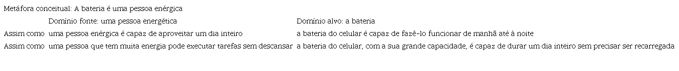Na publicidade brasileira, assim como na chinesa, o tradutor precisa transmitir a mesma caraterística da bateria, entretanto, optando pela metáfora: a bateria é uma pessoa enérgica. O domínio alvo é apresentado visualmente, e o domínio fonte é apresentado textualmente. A metáfora é justificada pela frase, “aproveite cada dia poderoso”. A lógica é que, quando uma pessoa está sempre vigorosa, ela tem bom ânimo para passar cada dia da vida, assim como a bateria do produto, que possui uma grande capacidade elétrica (energética), capaz de “continuar rodando” (podendo ser aproveitada) de manhã até à noite.