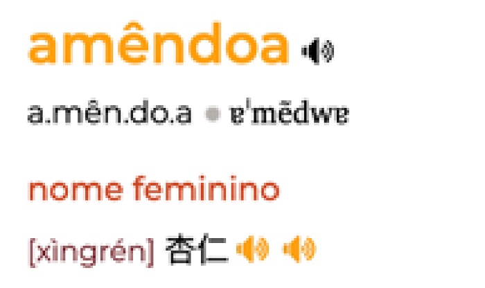 No entanto, a associação de “amêndoa” com “杏仁 (xìng rén)” pode resultar numa confusão de conceitos (figura 2). A etimologia da palavra “xìng rén” tem origem na fruta damasco, cujo nome em chinês é “杏” enquanto nome binominal é Prunus armeniaca. A sua história de cultivo e consumo remonta a tempos longínquos na China. O significado de xìng rén é justamente o caroço ou o miolo do caroço de damasco, pois este tem sido consumido como um tipo de fruto seco no Extremo Oriente e usado na fitoterapia tradicional chinesa desde antiguidade. A respeito de “amêndoa”, é o fruto da amendoeira, designadamente, Prunus dulcis, e os seus nomes em Chinês são respetivamente “扁桃仁 (biǎn táo rén)” e “扁桃 (biǎn táo)”. No mercado chinês, amêndoa também é conhecida pelo seu nome popular “美国大杏仁 (měi guó dà xìng rén)”, cujo significado na língua chinesa é “grande miolo do caroço de damasco dos Estados Unidos”. Quer seja um erro na tradução, quer seja uma estratégia de marketing, o uso misto da palavra “xìng rén” já foi observado em 1889 (Kirschner & Hsieh, 2012). Contudo, este uso misto pode causar o mal-entendido de um conjunto de conceitos, visto que estes são, de fato, duas espécies totalmente diferentes e os seus frutos contêm nutrientes distintos. Ademais, o damasco ainda é um tópos imprescindível e folclore na literatura clássica chinesa, cuja importância na sua cultura não se pode substituir por qualquer outra planta. Embora se encontre o primeiro registo escrito sobre amendoeira na dinastia Tang (618-906 d. C.), esta planta originária exótica não produziu um grande impacto na cultura chinesa e também por causa da sua origem da Ásia Central, amendoeira e o seu fruto possuem outro nome em Chinês, “巴旦木 (bā dàn mù)”, possivelmente derivada da língua uigur ou persa, bâdâm (Kirschner & Hsieh, 2012).