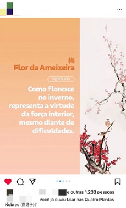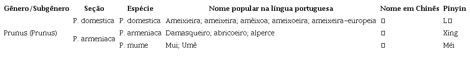Falando das espécies do subgênero Prunus do gênero deste nome idêntico da família botânica Rosaceae, o qual é conhecido por “ameixeira”, “ameixoeira” ou “amêixoa”, podem-se encontrar ainda mais não correspondências entre as duas línguas. Uma instituição pública chinesa sediada no Brasil publicou na sua página da rede social uma vez uma imagem com uma descrição “Como floresce no inverno, representa a virtude da força interior, mesmo diante de dificuldades” sobre a “flor da ameixeira”, uma das “Quatro Plantas Nobres” (figura 3). Com efeito, esta planta que pretendiam indicar era “梅 (méi)”, ou “mui”, que é entendido por Dalgado, (1919, p. 77) como “nome que se dá em Macau às ameixas e aos abrunhos”, sendo igualmente um tópos importante na literatura chinesa. Contudo, a tradução de méi para “ameixeira” pode originar desentendimento, uma vez que a florescência desta planta ocorre na primavera e não no inverno como se ilustra na imagem. De fato, o nome binominal da méi é Prunus mume, sendo igual ao damasqueiro, vista como uma espécie biológica individual da seção Prunus armeniaca (tabela 1). Méi teve a sua origem na China e desempenha um papel bastante relevante na cultura chinesa, cujo impacto chegou a influenciar os países vizinhos ao longo da história, tais como, Japão e Coreia (Li & Liu, 2011). A partir disso, deu origem à palavra originária de Japonês “umê” em Português do Brasil, devido à influência migratória japonesa. Em conformidade com Franco Aixelá (2013, p. 191), “em uma língua tudo é produzido culturalmente”, por outras palavras, a inexistência ou diferença relativamente ao seu valor cultural ocasiona o problema de aceitabilidade ou opacidade ideológica ou cultural. É, por isso, inquestionável que o contexto cultural faz uma parte indispensável na tradução, sobretudo quando a palavra possui um significado cultural sui generis na língua de partida. Segundo Mao (2019), isto é, com efeito, uma questão de escolha entre “aparência” e “espírito” quando não é possível manter simultaneamente os dois. A força comovente da língua reside no “espírito”, contudo isto também é mais difícil de preservar. Sendo membro do subgênero biológico Prunus, a adoção do nome “ameixeira” neste caso pode ocasionar equívoco, particularmente tomando em consideração o facto de desconhecimento da planta pelo público-alvo, falantes da língua portuguesa devido ao isolamento geográfico, já que, nas palavras de Martins (2018, p. 242) “é por meio do léxico que ordenamos, identificamos as semelhanças e as diferenças e estruturamos o mundo à nossa volta”.