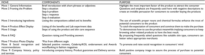 For the annotation of the corpus, the tool chosen was Atlas.ti (Version 24.0.1 (29783)) because its cross-tabulation function meets the need for cross-query in certain move resources. The annotation procedure follows the steps of Bhatia (1993) mentioned in the previous section. Nine moves can be identified in the genre of PDP in both languages: General information, Framing the problem, Introducing the ingredients, Product effect display, Usage, FAQ, Social recognition and recommendations and Company history, policy and services. Figure 1 provides a comprehensive summary of the moves identified in the corpus, accompanied by corresponding descriptions.