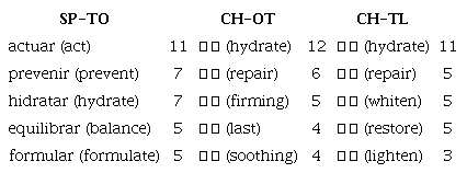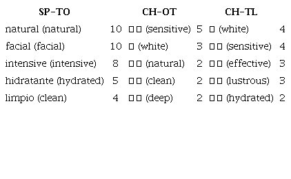 The words used in describing the product in the three corpora are rather consistent, except for the character “白(white)” that appears in both Chinese corpora. The character appears as an adjective that means “white” and also combines with another character to form the verb “whiten”. No direct word with the exact same meaning can be found in the Spanish corpus, meaning that there exists a cultural preference for whitening effects in the Chinese context. This showed a preference for adapting cultural content into the localized text, catering to the preferences and expectations of the target audience.