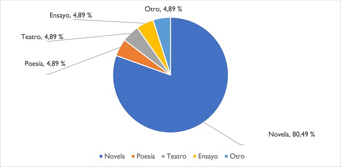 Según los datos estadísticos basados en el Catálogo bibliográfico general de China y el Nuevo catálogo bibliográfico de China, en el periodo comprendido entre 2000 y 2019, se contabilizan en China un total de 526 obras españolas entre ediciones y reediciones de todo tipo de género literario (Ma, 2021). Dado que hay ciertas obras que no se tienen en cuenta en el corpus de la presente investigación (los libros infantiles o juveniles, las variantes de las obras clásicas, así como los libros de carácter científico o técnico), se ha recurrido igualmente a los catálogos ofrecidos por la Biblioteca de Antonio Machado (Pekín), la Biblioteca Miguel de Cervantes (Shanghái) y las principales editoriales chinas. Al hacer la revisión, se observa una totalidad de 78 libros publicados entre 2000 y 2021. A ellos se les suman otras cuatro publicaciones archivadas en la base de datos de China Academic Library & Information System (CALIS), que son Dos leyendas (2019), de Gustavo Adolfo Bécquer, La Gitanilla (2019) y Don Quijote de la Mancha (2020), de Miguel de Cervantes, y Cantar de Mio Cid (2020). Entre estos 82 libros figuran: una antología poética que ha recogido 351 obras de 34 poetisas contemporáneas, 28 novelas femeninas e Historia de mujeres (2005), de Rosa Montero; esta última es la única obra de no ficción de autoría femenina. Conforme a lo que cabe esperar, el género narrativo sigue situándose en el primer término (véase la Figura 1).