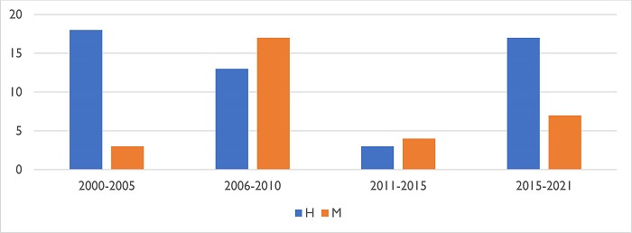 Teniendo en cuenta que algunas palabras clave precisas pueden no resultar efectivas en la búsqueda, hemos ampliado nuestro enfoque utilizando términos más genéricos como “literatura española” y “narrativa española”. Posteriormente, hemos filtrado manualmente las entradas obtenidas. Como resultado final, hemos localizado once artículos publicados entre 2000 y 2021 que abordan temas relacionados con la literatura femenina española. Gracias a la lectura de estos trabajos, se toma conciencia de que la literatura de posguerra ha sido el objeto de investigación elegido con mayor frecuencia y en relación con este aspecto, Carmen Laforet, Rosa Chacel, Soledad Puértolas y Marina Mayoral son los nombres que se mencionan de manera repetida. Con la excepción de un trabajo que se centra en el análisis de la poesía femenina del Siglo de Oro (Hei, 2016), todos los demás se circunscriben a la novela. Los temas discutidos varían entre las figuras femeninas (Ren, 2019; Wang, 2005; Zhang, 2013; Zhao, 2021), la evolución de la escritura femenina española (Xu, 2011), la escritura del cuerpo femenino (Zhang & Yu, 2020), así como investigaciones específicas sobre una escritora determinada (Gui, 2019, 2021; Wang, 1999; Yang, 2011).