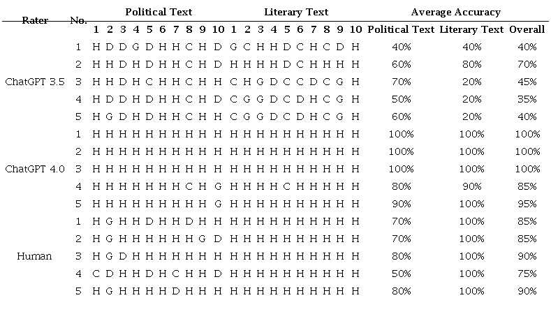 Furthermore, a comparison of the 5 sets of assessment results given by human raters and GPT (see Appendix) shows that the highest accuracy rate achieved by human raters is 90% (with two raters both achieving this score). In contrast, GPT-4 consistently achieves 100% accuracy for all 20 sets of texts across 3 sets of assessment. This suggests that as technology advances, it is highly likely that machines will be able to accurately identify humans’ translations, while humans may err and struggle to identify machine-generated translations.