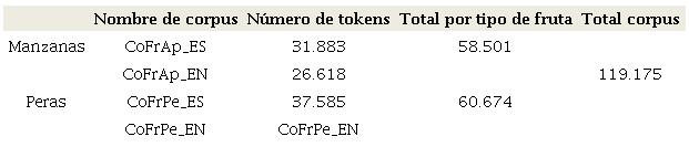 Por lo que respecta a la representatividad de CoFR, la representatividad cualitativa se ha conseguido con la inclusión de textos que pertenecen al mismo género textual, en inglés y en español, procedentes de diferentes empresas y redactados originalmente en las mencionadas lenguas. En cuanto a la representatividad cuantitativa, definida como “la terminología básica empleada en este género” (Seghiri, 2017, p. 50), ésta se ha calculado con el programa ReCor (Corpas Pastor & Seghiri, 2010; Seghiri, 2015), con el que hemos obtenido la densidad léxica, que marca que el corpus es representativo con un mínimo de 200 textos y 23.000 tokens o casos. En términos de tamaño (ver Tabla 1), este corpus está compuesto por unos 120.000 tokens, aproximadamente 60.000 en cada idioma y 30.000 para cada fruta y lengua.