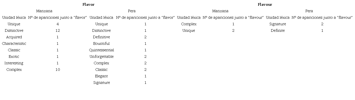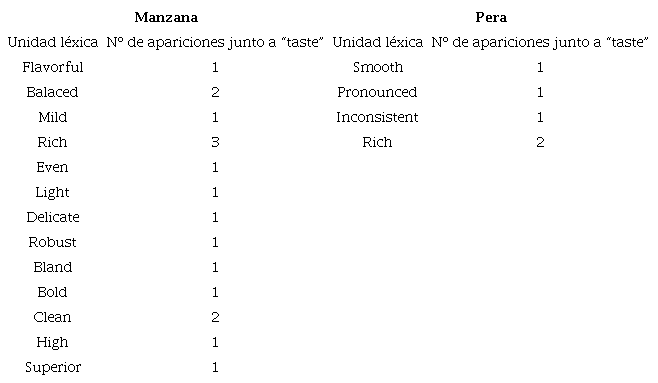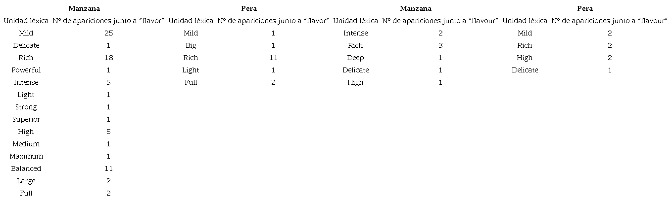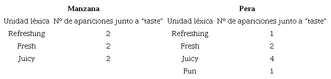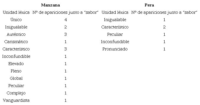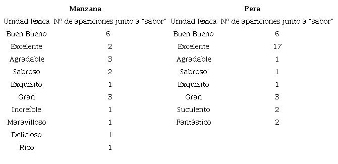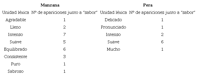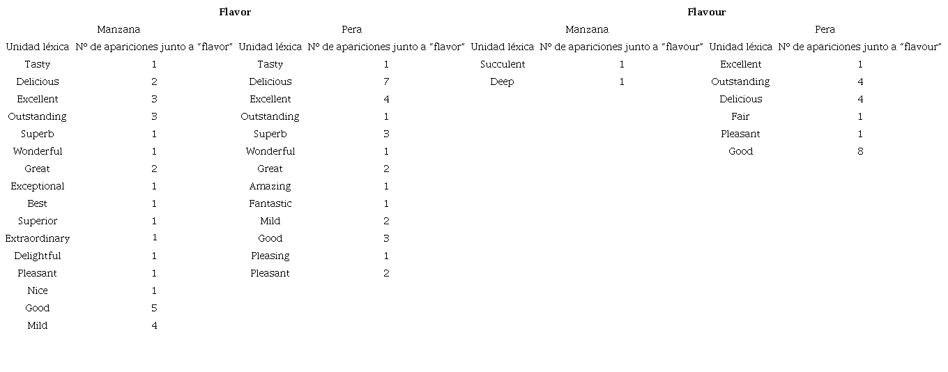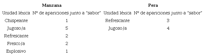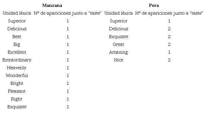Las tablas de la 2 a la 5 muestran una relación de las unidades léxicas identificadas relativas a estas menciones al placer experimentado al comer una pieza de fruta, asociadas a cada uno de los cuatro marcos cognitivos analizados (sabor, aroma, taste, flavor/flavour). Estos datos nos presentan diversos ejemplos de adjetivos descriptivos que contribuyen a la exposición favorable de las características de peras y manzanas, permitiendo una semblanza elogiosa de las mismas.