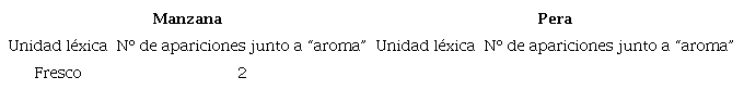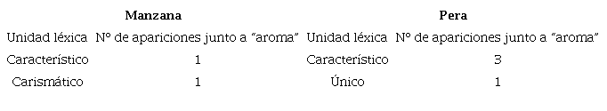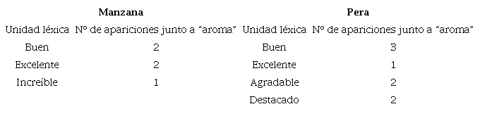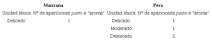 La apreciación olfativa exhibe una subjetividad superior a la gustativa, debido a la intangibilidad inherente de los olores (Planelles, 2013). Aquí, las unidades léxicas referidas al término nodo aroma (tabla 3) son escasas, tanto en el caso de las manzanas como en el de las peras. Buen, que claramente no es una palabra altamente evaluativa, es la más frecuente en términos globales.
