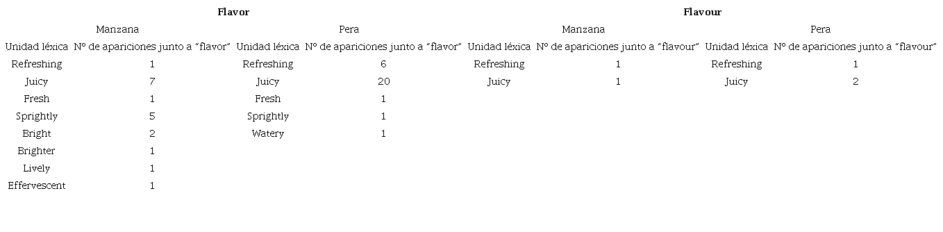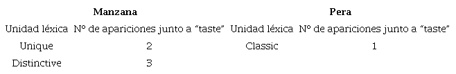 En el caso del sabor (tabla 6), se ha identificado una mayor variedad de adjetivos en el corpus de manzanas que en el de peras, aunque con un bajo índice de frecuencia. Una serie de palabras aluden al sabor único de las peras y manzanas descritas (específico, pleno, único, inigualable, global, diferencial, característico, inconfundible, elevado). La intención es el enfatizar y remarcar la singularidad de la fruta [7].