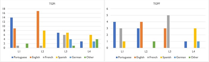 Portuguese was the most common Language 1 (L1) in both classes, followed by English and French, as was to be expected. Indeed, mobility students from Britain and France tend to choose these classes, which are taught in English and French, to improve their Portuguese language skills rather than to learn how to translate. Other first languages were Russian and Italian in TGPI and Spanish in TGPF. English clearly dominated as L2, while Portuguese, Spanish, French and German were L2, L3 or L4.