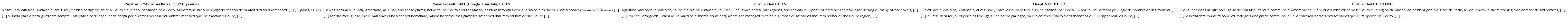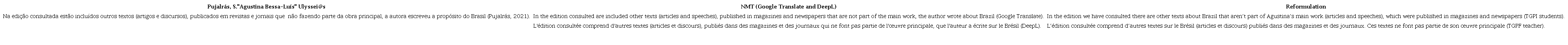 The second example consists of the post-editing of NMT from Portuguese into French of the same sentence. The table includes a fourth column, which presents the reformulation of the excerpt.
