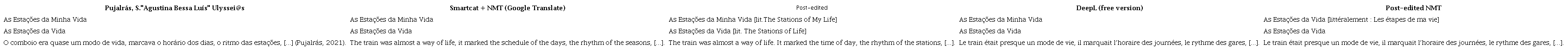 Apart from the book title, two occurrences of estação are unambiguous and were adequately translated by NMT engines. The first refers explicitly to Portuguese railway stations (estações ferroviárias portuguesas). The second compares railway stations to airports (a estação, como hoje os grandes aeroportos). The other occurrence, however, may be regarded as ambiguous: O comboio era quase um modo de vida, marcava o horário dos dias, o ritmo das estações, ... (The train was almost a way of life. It marked the time of day, the rhythm of the stations, [...]). In the phrase ritmo das estações, the literal meaning of season (saison in French) is more natural, but the subject comboio (train) points to a possible ambiguity. TGPI students replaced Google Translate most probable output seasons by stations, which probably seemed more adequate in this context, while DeepL selected gares and TGPF students left this segment unchanged, though the choice may be questionable.