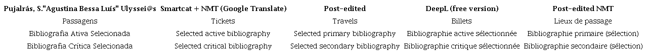 The section Passagens lists the names of all the countries visited by the artist. The meaning of this polysemic word in this context is ‘places one passes by’ and obviously not tickets in English or billets in French, as might be the case in the purchase of a plane ticket, for example. During the pre-translation phase, when negotiating the translation brief, students had been instructed to stick to the terminology already in use for headings in Ulyssei@s since 2016. They complied with these instructions and successfully post-edit NMT outputs.