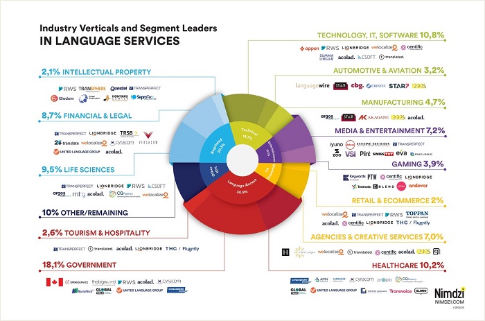 La industria del entretenimiento audiovisual no para de crecer y, según la empresa Nimdzi1, la suma de media & entertainment (7,2 %) y de gaming (3,9 %) supuso un 11,1 % de la industria de los servicios lingüísticos en 2023, con empresas destacadas en el sector como Iyuno-SDI, Deluxe, Transperfect y Zoo Digital entre otras.