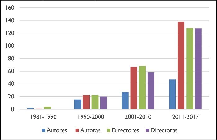 Otra cuestión que nos resulta interesante es la dirección de trabajos doctorales en esta disciplina, ya que, hasta hace unos pocos años, a pesar de que siempre había habido más doctorandas en TAV, el número de directoras de tesis siempre había sido inferior. Sin embargo, la Figura 4 (Pérez Escudero, 2018, p. 171-172) que vemos a continuación confirma un acercamiento en la segunda década del nuevo milenio.