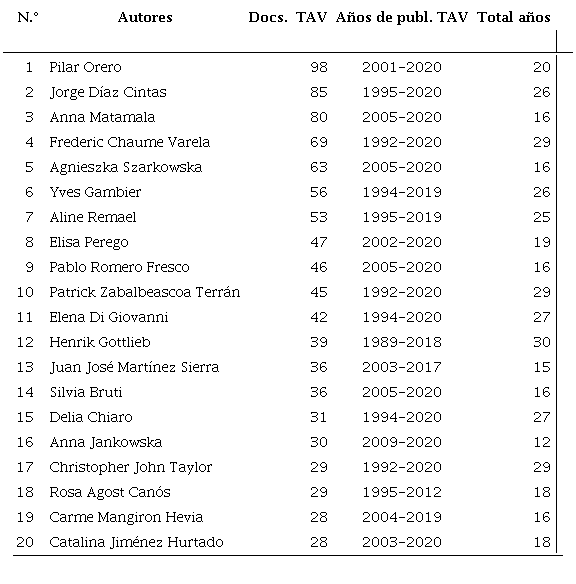 En cuanto a la situación en España, Botella Tejera (2021, p. 11-12), recogía que las autoras nacionales con más publicaciones según BITRA eran Pilar Orero (98), en primer lugar; Anna Matamala (80), en tercer lugar; y más adelante encontrábamos a Rosa Agost (29); Carme Mangiron (28); Catalina Jiménez Hurtado (28) y Noa Talaván Zanón (27). De hecho, entre los diez autores españoles con más publicaciones en TAV, teníamos a seis mujeres y a cuatro hombres. Aunque estas cifras tienen ya cierto tiempo, no deja de resultar interesante repasarlas.
