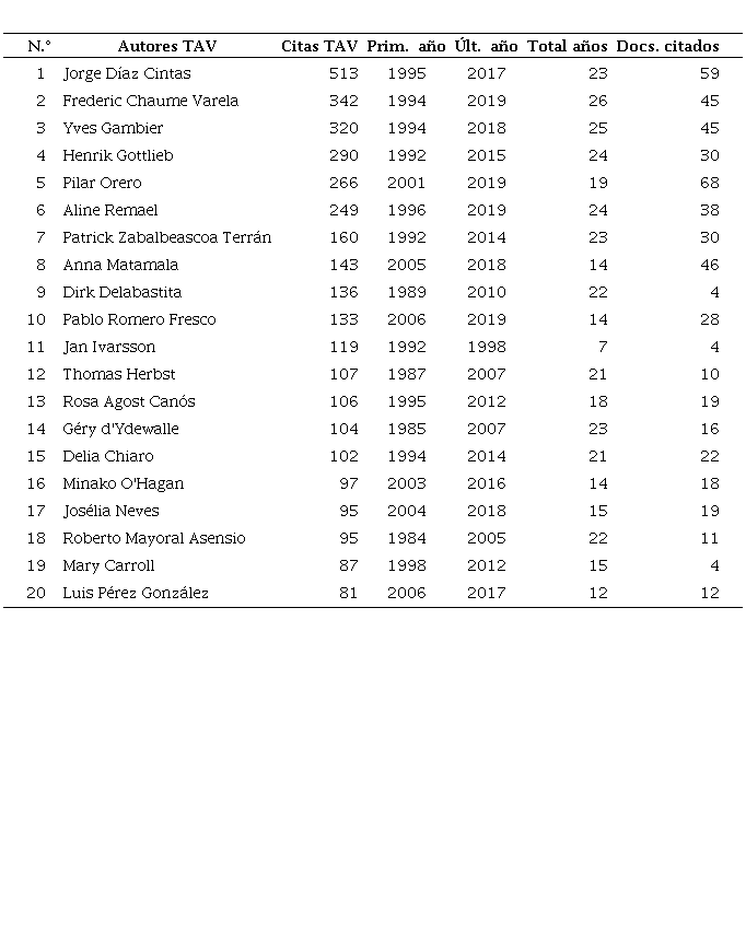 Ahora bien, si nos acercamos a las citas, cuestión que resulta de gran importancia en el mundo académico, según la investigación doctoral de Pérez Escudero (2021) en BITRA, hay que esperar hasta el quinto puesto para encontrar a la mujer más citada de entre las mencionadas anteriormente: Pilar Orero, con un total de 266 citas en la base de datos y 68 documentos citados. Si salimos de BITRA, los resultados de citas de la investigadora siguen siendo impresionantes en otras bases de datos: 399 en Scopus, 274 en WoS y 3884 en Google Scholar (Pérez Escudero, 2021, p. 549). Sin embargo, aunque había más mujeres en la lista de los autores con más publicaciones en TAV que hemos repasado, solo aparecen ocho entre los 20 con más citas (ver Figura 3).