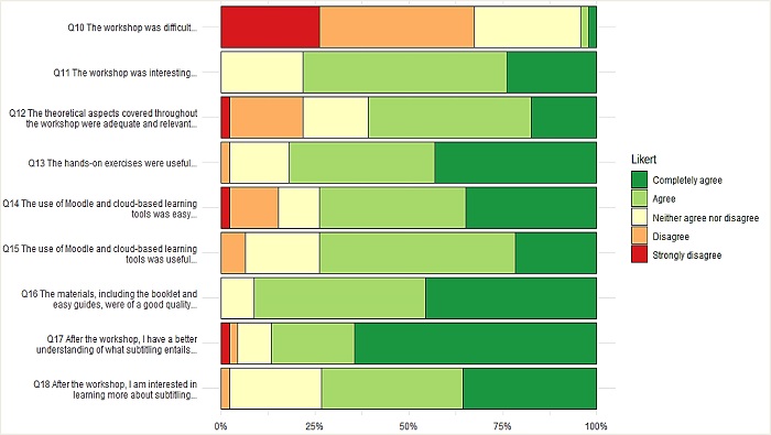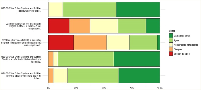 Respondents were asked to complete five Likert-type questions to elicit their perception of the cloud-based subtitling platform and its pedagogical potential. Although there are standardised tests available for research on software usability – see e.g., Brooke’s (1996) system usability scale – the nature of the sample and the context of the experiment were taken into account when producing an ad-hoc questionnaire. The questions were therefore simplified and placed greater emphasis on whether the tool was suitable for learning purposes.
