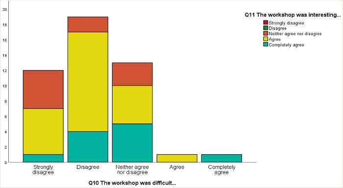 The high medians for questions 11 to 18 (see Table 2) correspond to the respondents’ favourable agreement with each statement. Question 10 has a significantly lower median because participants disagreed that the workshop was challenging, so this is a positive outcome too. The standard deviation and variance values show a slight disparity among participants.
