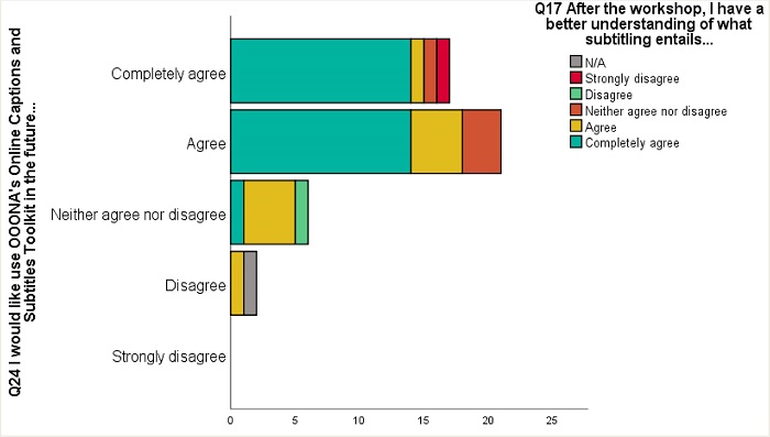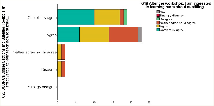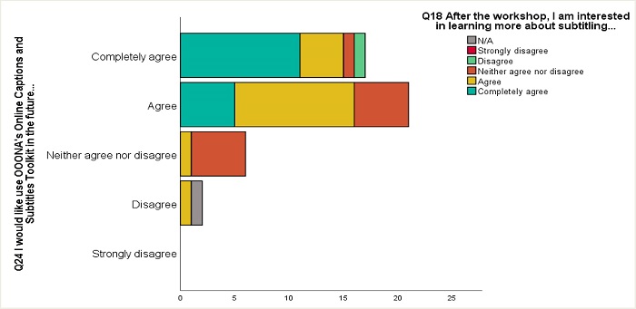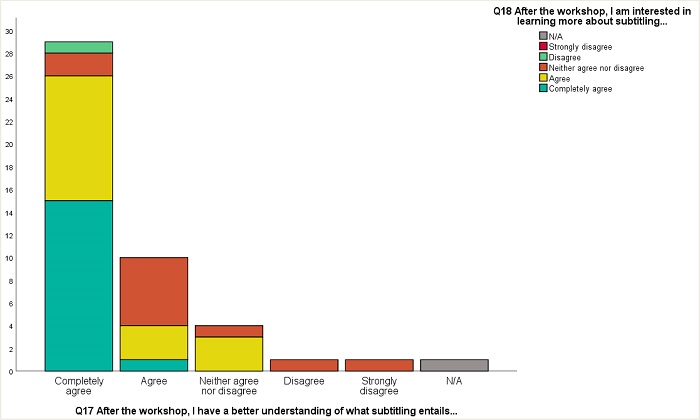 Another ten respondents included similar comments, arguing that “the theoretical section was a bit too long” or that it “included too much unnecessary information […] in comparison to the practical side”. This input triggered changes in designing subsequent workshops, in which theory was significantly shortened and adjusted. As shown in Figure 1, most respondents (39, 85%) completely agreed or agreed to have achieved a better understanding of subtitling at the end of the workshop, whereas 4 (9%) neither agreed nor disagreed, 2 (4%) disagreed, and 1 (2%) did not answer the question. Furthermore, 33 (72%) respondents completely agreed or agreed they were interested in learning more about subtitling, whereas only 1 (2%) respondent explicitly disagreed that they would like to learn more, and 11 (24%) claimed that they would neither agree nor disagree, but one respondent failed to answer this question. When compared, these figures offer interesting insights because 30 (65%) participants reported having gained a better understanding of subtitling and being more interested in this discipline, as shown in Figure 3.