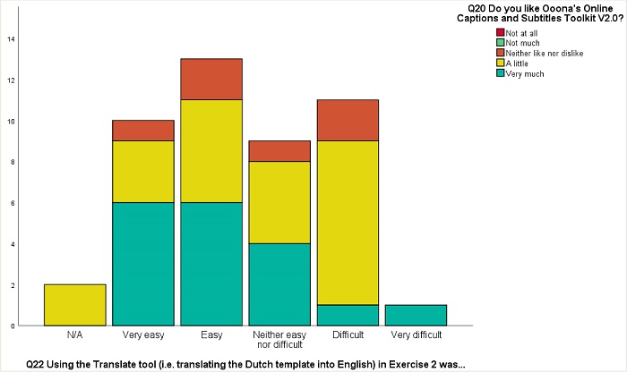 Respondents seemed to like the cloud-based subtitling platform very much (18, 39%) or a little (22, 48%), with only 6 (13%) respondents showing neither like nor dislike. The template-translation tool used by all respondents during the translation exercise was considered very easy by 10 (22%), whereas 1 (2%) person claimed it was very difficult. Almost half of the respondents found the tool easy (13, 28%) or neither easy nor difficult (9, 20%), but 11 (24%) considered it to be difficult.