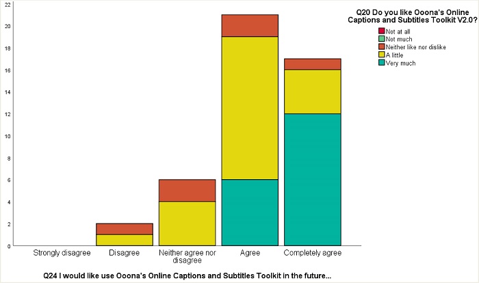 When asked whether or not they would consider subtitling in cloud platforms in the future, 38 (83%) answered that they would (Figure 6). In fact, only 2 (4%) respondents reported that they would not use it in the future, while another 6 (13%) remained doubtful. This result shows the respondents’ positive disposition to use the tool in future. Having said that, respondents were not asked to specify whether this would be for professional or educational purposes. As seen in Figure 6, 35 (76%), participants liked the tool a little or very much while claiming that they were likely, or very likely to use it in the future. Again, participants who liked the tool a little (13, 28%) tended to agree that they would use it in the future, while those who liked it very much (12, 26%) were equally prone to agree with such a statement completely. As obvious as this may seem, the results are a testament to the overall satisfaction as regards the online subtitling tool.
