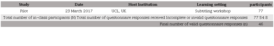 The experiment was conceived as a situated learning experience (González-Davies & Enríquez-Raído, 2016), echoing project-based and socioconstructivist approaches. It therefore comprised semi-authentic tasks (Kiraly, 2000) in the form of a hands-on subtitling workshop run as part of the Dutch Student Days (alcs.ac.uk/student-days), held at University College London (UCL), UK, in late March 2017. This workshop, attended by over 77 undergraduate students of modern languages, was funded by the Association of Low Country Studies (ALCS) in partnership with four UK universities (Newcastle, Nottingham, Sheffield, and UCL) and the Embassy of the Netherlands in the UK. The non-response error also occurred in this survey, and the final number of valid surveys was lower than the number of participants, as illustrated in Table 1: