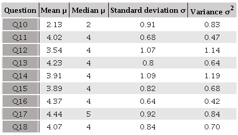 The values shown in Table 3 show that overall mean and median values remain steadily high, except for question 22, because the low values assigned to it were easy and very easy, which ought to be considered equivalently positive in this context.