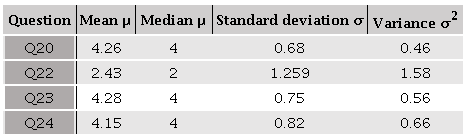 The responses to questions 20 to 24 revealed higher standard deviation and variance values (Figure 4).