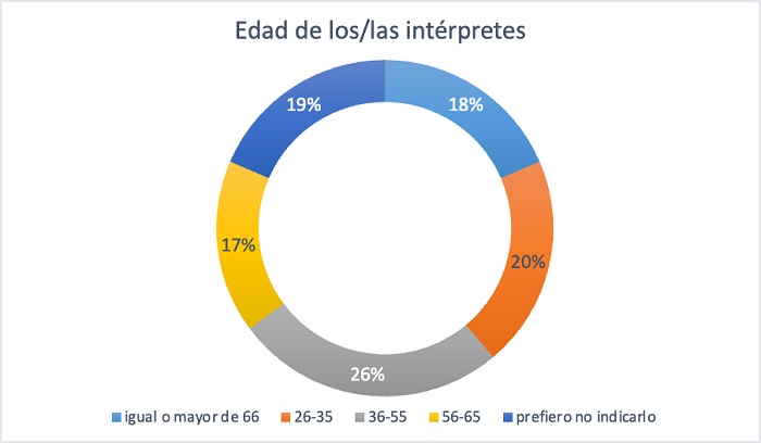 Atendiendo a las características generales de las y los intérpretes, conviene destacar que el número de mujeres es superior al de hombres tanto si se observan los números generales como en el grupo específico de ILSE. Por lo que se refiere a la edad de las y los intérpretes, en el colectivo de ILSE los grupos de edad corresponden a las franjas de 26 a 35 años, de 36 a 45 y de 46 a 55, con un predominio de la segunda. No hay respuestas de personas mayores de 55 años, lo cual es congruente con el hecho de que esta práctica profesional es reciente en España. Se suele considerar que se inició en 1987 con la creación por parte de la CNSE (Confederación Estatal de Personas Sordas) del Servicio Oficial de Intérpretes Mímicos (CNLSE, 2014, p. 54).