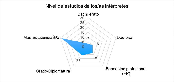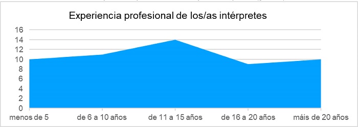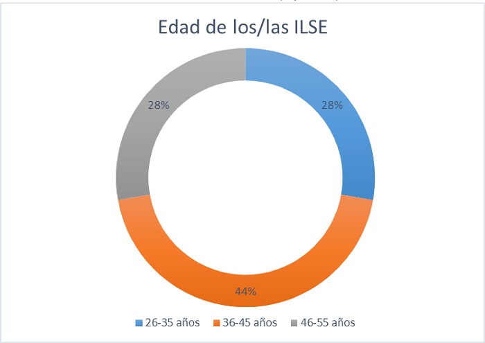 El colectivo de ILSE constituye un grupo mayoritariamente femenino (al igual que el de intérpretes en general), con edades comprendidas entre los 26 y los 55 años, con un predominio de la franja que abarca entre los 36 y los 45 años. En cuanto a la experiencia, es visible la superioridad numérica de las personas que llevan entre 11 y 15 años ejerciendo la profesión, en particular en el caso de ILSE, probablemente debido a que el número de respuestas es más reducido. Por lo que se refiere al nivel de estudios máximo alcanzado, coinciden el grupo general de intérpretes y el específico de ILSE en un mayor número de personas con estudios de licenciatura y máster (más acusado en el grupo general). Este dato debe tomarse con precaución en el caso de ILSE, debido a que durante veinte años (de 1995 a 2014) una gran cantidad de intérpretes se formó en el título de Formación Profesional Técnico Superior en Interpretación de la Lengua de Signos. Por tanto, se apunta la posibilidad de que la muestra no sea representativa de la totalidad del colectivo.