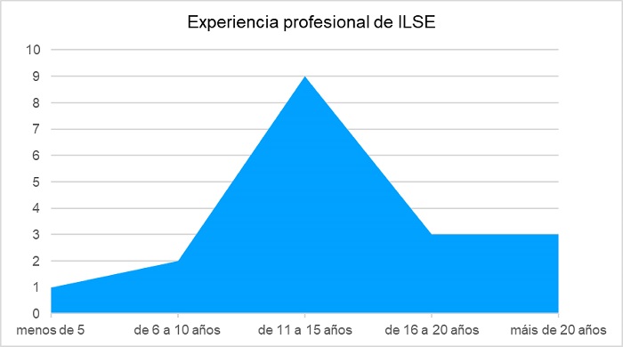 En cuanto a los años de experiencia profesional, el gráfico 3 muestra los datos correspondientes al grupo general y el gráfico 4 los del grupo específico de ILSE. Tienen formas similares, pero en el caso de ILSE, el menor número de respuestas se refleja en una mayor prominencia del grupo que tiene de 11 a 15 años de experiencia.