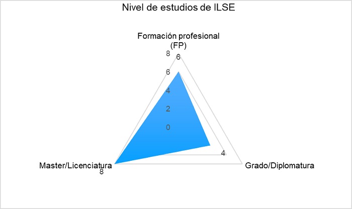 Los gráficos 5 y 6 muestran las respuestas a la pregunta relativa al nivel máximo de estudios completado. La diversidad de titulaciones es inferior en el caso de ILSE, con la particularidad de que ambos gráficos presentan una mayor cantidad de casos con estudios de máster o licenciatura. No coincide este dato con el hecho de que un gran número de profesionales se han formado en el marco del título de Formación Profesional Técnico Superior en Interpretación de la Lengua de Signos, que se creó en 1995 y desapareció en 2014.