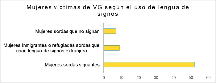 Algo similar ocurre con la tipología de las víctimas. Se aprecia una mayoría de víctimas migrantes en el grupo general (gráfico 9), en tanto que las mujeres sordas signantes son mayoría (gráfico 10). La superioridad de este dato sobre el del número de mujeres sordas que no signan debe achacarse al hecho de que la población meta del cuestionario son intérpretes, y por tanto la situación más frecuente es que se les asignen servicios que se presupone implican un intercambio en dos lenguas. Se debe tener en cuenta, no obstante, que la comunidad sorda signante representa solo una parte de todas las personas que tienen una discapacidad auditiva. De acuerdo con los datos del INE (2020) en España hay 1.203.700 personas mayores de 6 años con una «dificultad importante para oír una conversación con varias personas sin audífono u otro tipo de ayuda para oír». La cifra de personas sordas signantes es más difícil de determinar. Se estima unas 70.000, a partir de un porcentaje de 0,15% de usuarios/as de una lengua de signos en Europa CNLSE (2014, p. 17). No obstante, los datos del INE (2020) son inferiores: solo 27.300 personas de seis o más años de edad serían usuarias de una lengua de signos en España. A partir de estas cifras se deduce que el número de mujeres sordas que no signan es probablemente bastante superior al de las que signan. Esto por supuesto no invalida los resultados del análisis, pero sirve para contextualizar la realidad de las mujeres sordas víctimas de VG. Nos permite además vislumbrar que en los intercambios comunicativos de estas mujeres sordas víctimas de VG con las y los agentes que las atienden en los diferentes servicios puedan existir problemas de intercomprensión que no queden resueltos satisfactoriamente, con el consiguiente riesgo e inseguridad en la toma de decisiones.