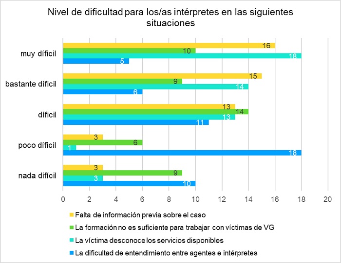 En relación al perfil de las víctimas, los datos muestran una mayoría de personas extranjeras (87%) para el trabajo de las y los intérpretes en general y, al contrario, un porcentaje elevado de personas nacionales (77%) en las intervenciones de ILSE. Por otra parte, los datos sobre la tipología de las víctimas evidencian una mayoría de migrantes cuando se tiene en cuenta a la totalidad de intérpretes y, en el contexto de la interpretación de lengua de signos española, predominan las usuarias sordas signantes. Un número reducido de estas usa una lengua de signos extranjera, y se visibilizan también casos de mujeres sordas que no signan. Cuando se pregunta por el nivel de dificultad de ciertas situaciones en el trabajo con víctimas de VG, la que se califica como más difícil es el desconocimiento de los servicios disponibles por parte de la víctima y, en segundo lugar, la falta de información previa sobre el caso. En contrapartida, no parece que la falta de entendimiento entre agentes e intérpretes constituya un obstáculo generalizado.