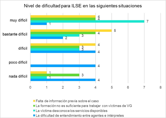 A la hora de valorar la dificultad para una serie de cuestiones en una escala de cinco (nada difícil, poco difícil, difícil, bastante difícil, muy difícil): a) dificultad de entendimiento entre agentes e intérpretes, b) la víctima desconoce los servicios disponibles, c) la formación no es suficiente para trabajar con víctimas de violencia de género y d) falta de información previa sobre el caso (gráficos 11 y 12), lo que más parece preocupar, tanto al grupo general como al específico de ILSE, es el b) la víctima desconoce los servicios disponibles. La falta de información sobre los apoyos que ofrecen las diferentes administraciones se perfila, pues, como un rasgo común entre las mujeres sordas y las migrantes, refugiadas y solicitantes de asilo. Todas comparten las mismas dificultades de comunicación y de escasa autonomía. En relación con la reducida autonomía de las mujeres sordas, uno de los factores determinantes es la sobreprotección que experimentan en general las personas sordas (Soroa, 2018). La misma autora señala que en el caso de las mujeres a esta sobreprotección se añade la educación sexista y los roles asignados por el patriarcado a las mujeres. En segundo puesto se valora como «difícil», «bastante difícil» o «muy difícil» la falta de información previa sobre el caso, aunque los datos muestran una mayor incidencia en el grupo general que en el de ILSE. El tercer lugar lo ocupa que no se considera suficiente la formación, y parece haber una menor preocupación en general sobre el entendimiento entre agentes e intérpretes.