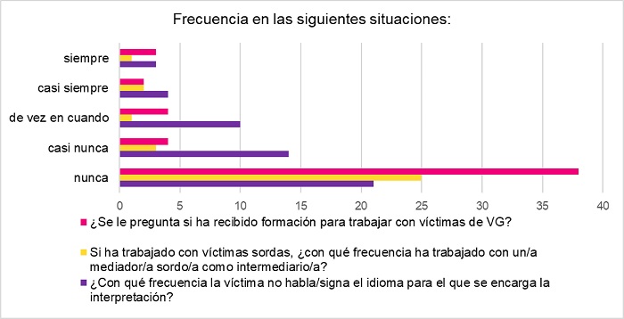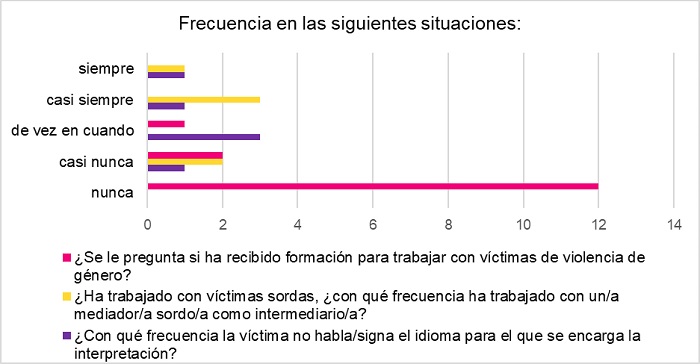 Por lo que respecta a las respuestas sobre la frecuencia de determinadas situaciones (gráficos 13 y 14) llama la atención que en el colectivo de ILSE es común que la víctima no signe la lengua para la que se ha pedido el servicio, siendo el caso de que no hay ninguna respuesta de «nunca», lo que sugiere que todas las personas que respondieron han pasado por la experiencia de encontrarse con que no podían comunicar con la víctima (o no podían hacerlo con la profesionalidad esperada). No parece prudente, no obstante, atribuir estos datos a la única circunstancia de que la víctima use una lengua de signos diferente a la española (en particular, una lengua de signos extranjera), puesto que puede tratarse de mujeres sordas que no signan.