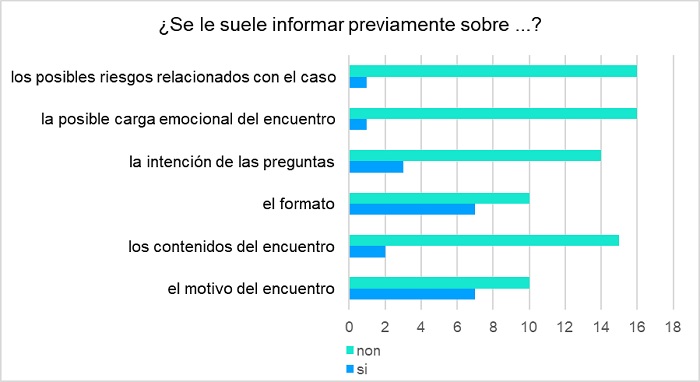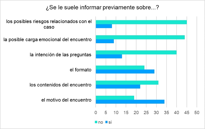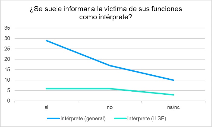 Por otra parte, los datos indican que se pregunta con escasa frecuencia a las y los intérpretes (en particular en el grupo de ILSE) si tienen formación en VG. Además, no suelen recibir información previa a la entrevista sobre cuestiones importantes para el desarrollo de su función, como los posibles riesgos relacionados con el caso, la posible carga emocional del encuentro o la intención de las preguntas. El grupo general suele informar a la usuaria de cuáles son sus funciones como intérprete, pero el de lengua de signos española lo hace con menor frecuencia.