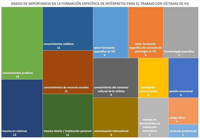 El análisis finaliza con una valoración de los temas que el público meta del cuestionario hace de la importancia de determinados temas en su formación como intérpretes. A pesar de la variabilidad de estos, se perfilan con bastante claridad los que más valoran: conocimientos jurídicos, formación sobre trauma en víctimas y, en tercera posición, conocimientos médicos, de recursos sociales y sobre trauma vicario/implicación personal.