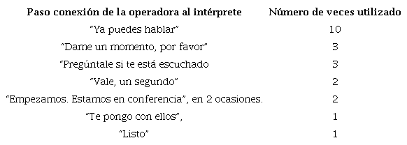 En general, el primer movimiento de apertura de la conversación suele terminar con el paso de la conexión de la operadora al intérprete y anunciar que ya pueden hablar con el cliente. Las frases que suelen repetirse para dar paso a esa conexión intérprete−cliente son, como ya hemos visto en ejemplos anteriores, y lo porcentajes de uso se exponen en la tabla siguiente (Tabla 1: Conexión OP-I).