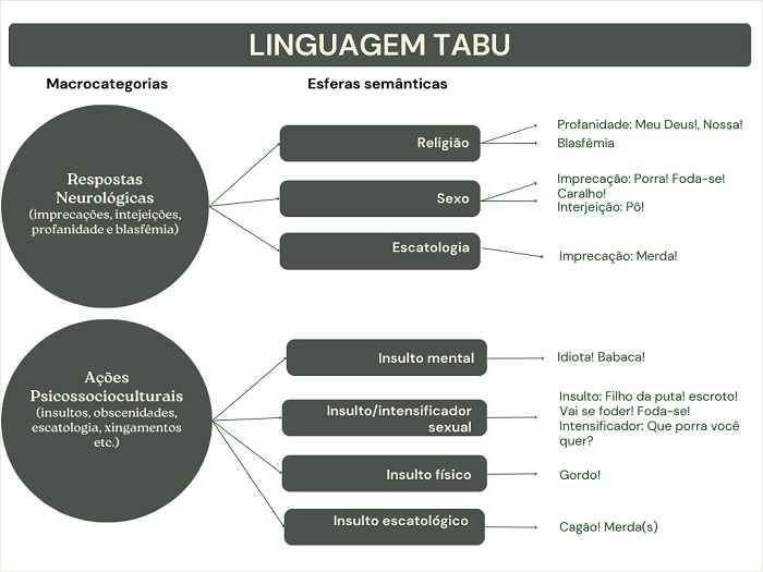 Esse conjunto de palavras, como veremos a seguir, está ligado a imagens tabu que se referem a diferentes domínios lexicais, como sexo, escatologia, seres sagrados e morte (cf. Allan & Burridge, 2006; McEnery, 2006), cujo emprego “[...] have the potential to be offensive, inappropriate, objectionable, or unacceptable in any given social context” (Beers Fägersten, 2012, p. 3). Embora essas palavras possam ser referidas de diferentes maneiras (por exemplo, xingamentos, palavrões, linguagem imprópria, profanação, obscenidade), adotaremos nesse artigo, de maneira intercambiável tanto o rótulo linguagem tabu, quanto o rótulo turpilóquio, indicando uma macrocategoria que inclui categorias semânticas como: palavrões, obscenidade, profanidade, blasfêmia, xingamentos, insultos, agressão verbal, insultos étnico-raciais, vulgaridade, gírias e escatologia.